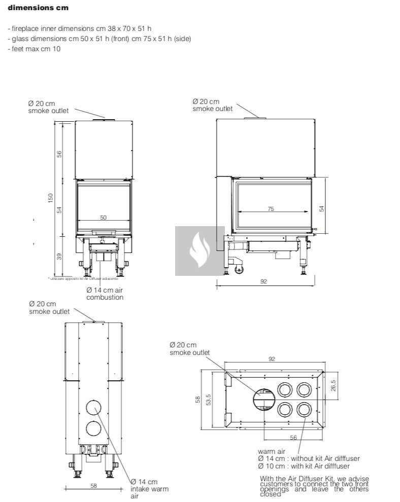 Az égőtéren lévő konvekciós burkolat miatt a felmelegített levegő levegő, 4 flexibilis csövén keresztül természetes légáramlással vagy ventilátoros rásegítéssel elvezethető más helyiségekbe.