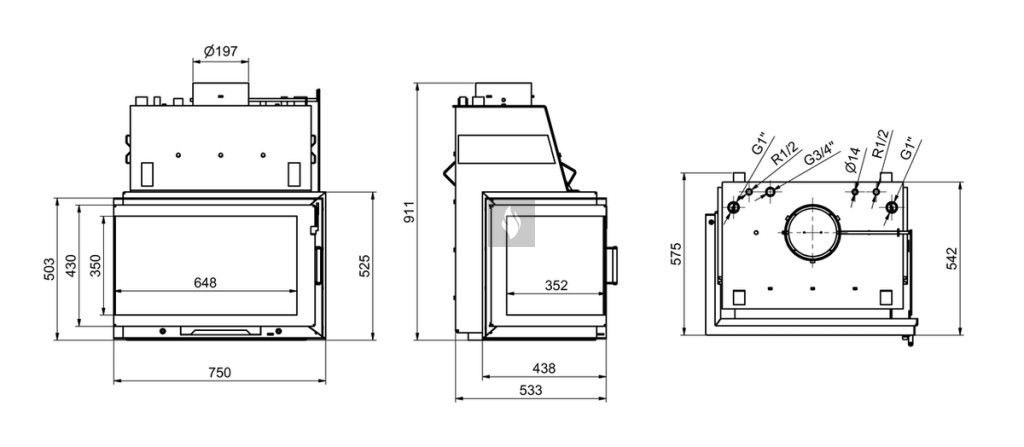 Vízköpenyes, vízteres kandallóbetét Lehetőség van szükség esetén a tűztér bélelésére, mely csökkenti a pára, illetve kátrány kicsapódást, valamint növeli a tűztér élettartamát. Nyílt, vagy zárt fűtési rendszerhez. További opciók: külsőlevegő csatlakozás.