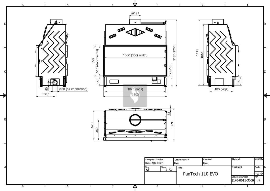 Firetechnic PanTech 110 EVO Légfűtéses kandallóbetét, Oldalra nyíló ajtóval. Üvegezés típusa: Síküveges. 21,0 kW névleges teljesítménnyel.