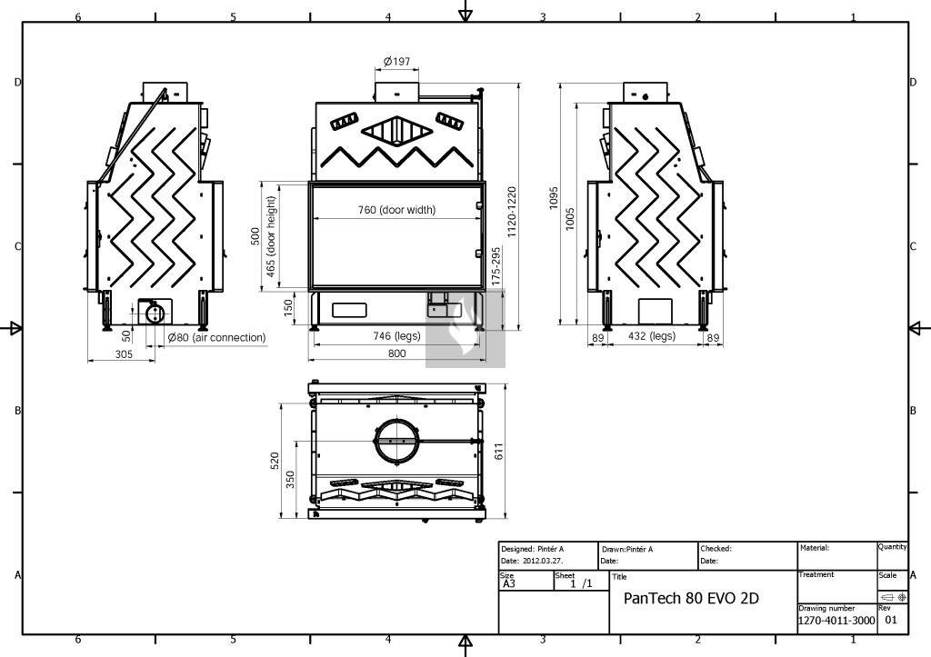 Firetechnic PanTech 80 EVO Tunnel Légfűtéses kandallóbetét, Oldalra nyíló ajtóval. Üvegezés típusa: Két ajtós, síküveges. 17,0 kW névleges teljesítménnyel.