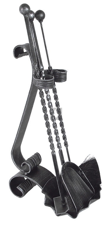 Desigonos megjelenésű kovácsoltvas kandallótisztító készlet, fekete lakkozott, ezüst festéssel.