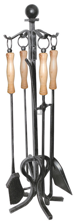 Kandallótisztító készlet, kovácsoltvas, fekete, fa nyéllel, 4 részes