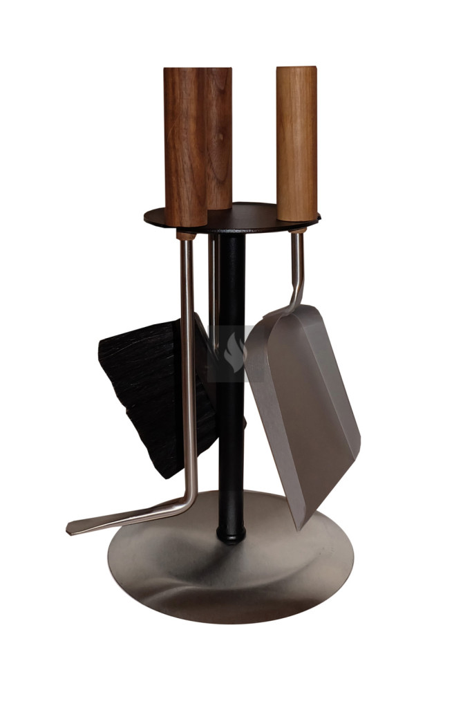 Fekete tartó, rozsdamentes acél eszközökkel, dió nyéllel.
