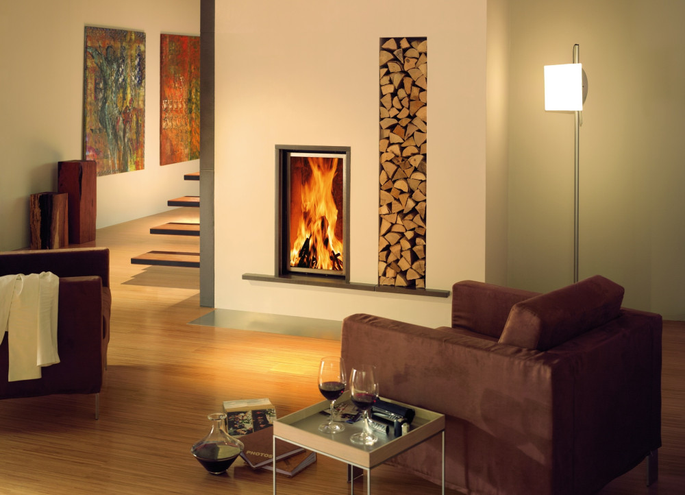 Modern, álfalas kandalló beépített fatárolóval, a tűztérbetét körüli, illetve a bal oldalra is víszintesen kinyúló barna márvány berakással. Ami igazán egyedivé teszi ezt a kandallót, az az, hogy a megszokott fektetett téglalap formát ezúttal felváltottuk egy álló téglalapra, mely rendkívül harmonikus egységet képez a mellett lévő, hasonló formájú, ugyanakkor méretében eltérő fatároló résszel. Az így kialakított dinamikus egyensúly révén rendkívül izgalmas kiegészítője lehet otthonának ez a kanadalló, mely a tárolórésznek köszönhetően ugyanakkor végtelenül praktikus is.