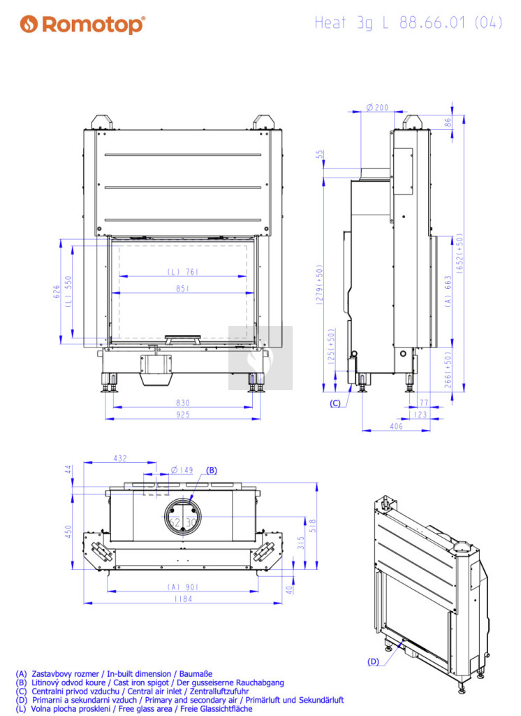 Romotop HEAT 3G L 88.66.06 Légfűtéses kandallóbetét, fekete béléssel