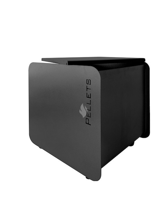Fekete tartó, kerékkel, fekete fából készült tetővel, 30 kg tároló kapacitással.