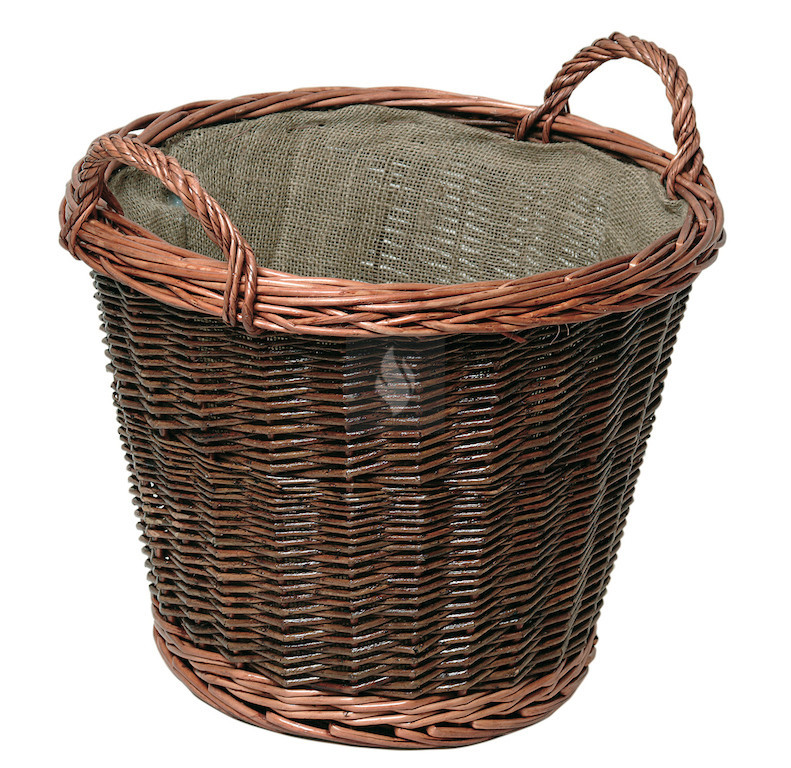 Mélyebb kialakítású fonott kosár, belül barna juta béléssel.