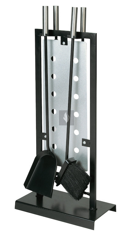 Kandallótisztító készlet, fekete tartóval, a fogantyúk és a betét rozsdamentes acélból készült.