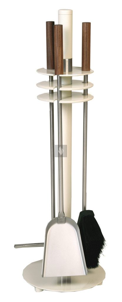 Elefántcsontszínű tartó, rozsdamentes acél eszközökkel, diófa nyéllel.