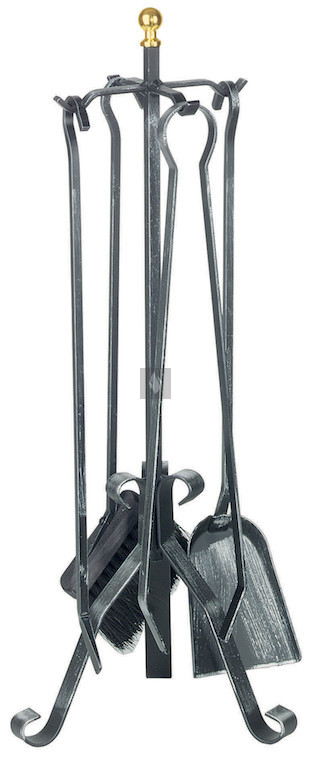 Fekete lakkozott, festett, kovácsoltvas kandallótisztító készlet, sárgaréz golyóval a tetején.