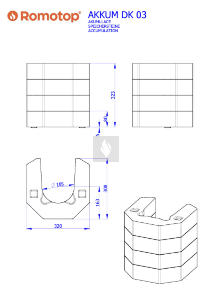 Ez a hőtároló szett a Romotop LERA C GH kandallókályhához lett kifejlesztve. Az égőtér felett kialakított helyre szerelhető be. Segítségével növelhető a kandallókályhánk hőtároló képessége. A sugárzó fűtés 4 órával meghosszabbodik a hőtároló szett tömegének köszönhetően. Az akkumulációs szett súlya 40 kg.