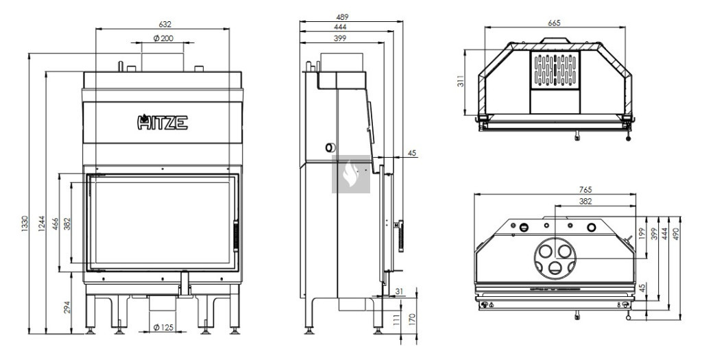 Az öntöttvas füstcső, amely ø180/200/220 mm-es és 360°-ban állítható, garantálja a kandalló és a kéménycsatorna szoros csatlakozását, biztosítva a megfelelő égést. Az acél ajtó speciális profilból készült, ami garantálja az anyag merevségét és a magas hőmérséklettel szembeni ellenállását. A hőálló kerámiaüveg (DECOR üveg) akár 800°C-ig ellenáll a működési hőmérsékletnek, és opcionálisan dupla üvegezési rendszerben is elérhető. A légfüggöny csökkenti a korom lerakódását a kandalló üvegén, biztosítva a „tiszta üveg” hatást. Az égéstér kerámia betétje felhalmozza a hőt, és akár 1000°C-ig ellenáll a hőmérsékletnek.