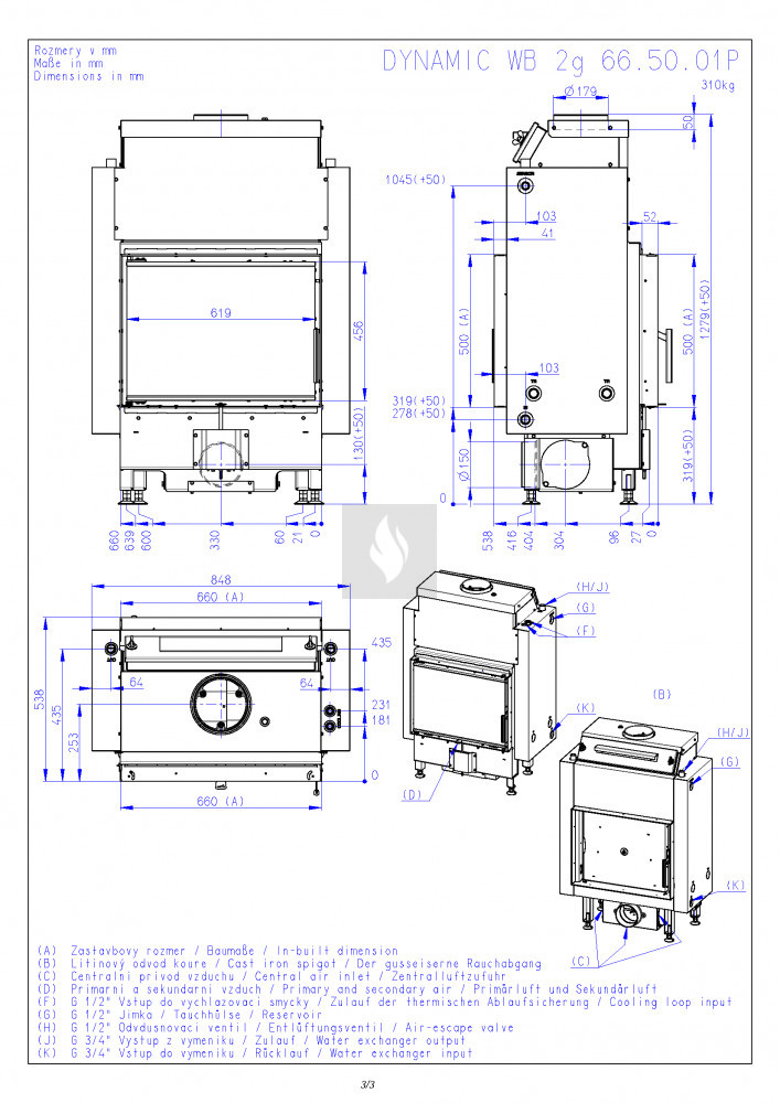 P modell - Tripla üvegezéssel ellátott vízteres kandallóbetét. A víztér külső borítása teljes felületén hőszigetelt, növelve ezáltal a vízoldali hőteljesítményt.