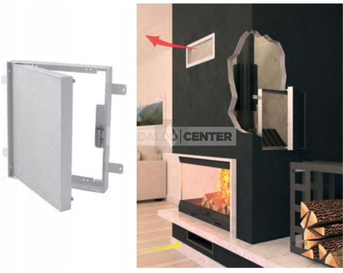 A szervízajtó biztosítja a felépítmény belsejéhez a könnyű hozzáférést anélkül, hogy ez befolyásolná a kandalló esztétikáját.