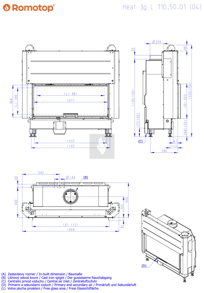 Romotop HEAT 3G L 110.50.06 Légfűtéses kandallóbetét, fekete béléssel