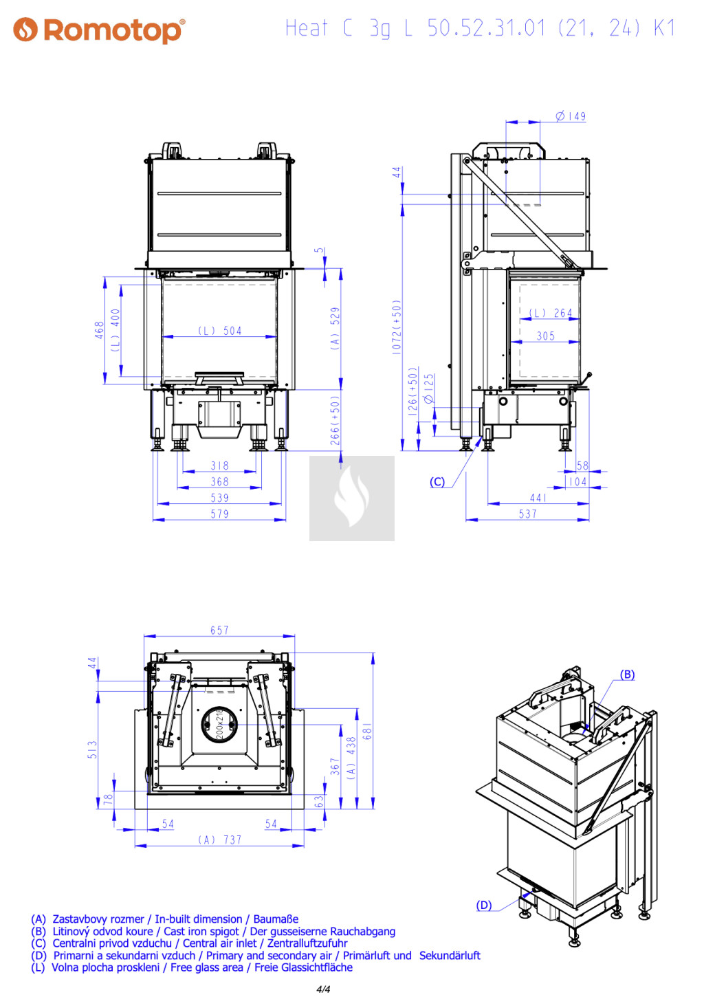 Romotop HEAT C 3G L 50.52.31.26 Légfűtéses kandallóbetét K1 kerettel, fekete béléssel