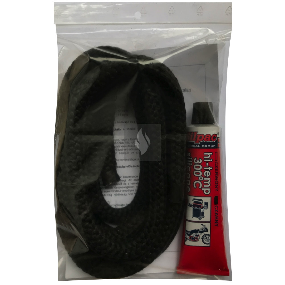 Hőálló tömítőzsinór cserekészlet, 10 mm átmérő, ragasztóval Tartalom: 2 m 10 mm-es fekete/szürke textilüveg tömítő zsinór, 1 db SILPAC hőálló szilikon ragasztó tömítőzsinórhoz 300°C 70ml fekete