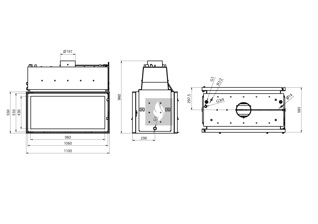 Firetechnic PanAqua 110 Tunnel 2 ajtós Vízteres kandallóbetét, 2 ajtós, oldalra nyíló ajtóval. Üvegezés típusa: Síküveges. 30,0 kW névleges teljesítménnyel.