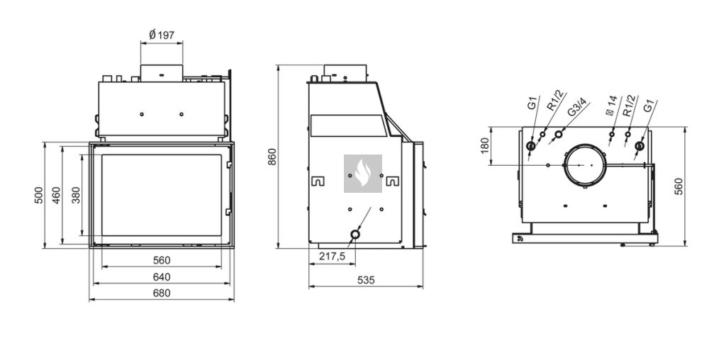 Lehetőség van szükség esetén a vízteres, vízköpenyes tűztér bélelésére, mely csökkenti a pára, illetve kátrány kicsapódást, valamint növeli a tűztér élettartamát. Vízköpenyes kandallóbetét nyílt, vagy zárt fűtési rendszerhez. További opciók: külsőlevegő csatlakozás.