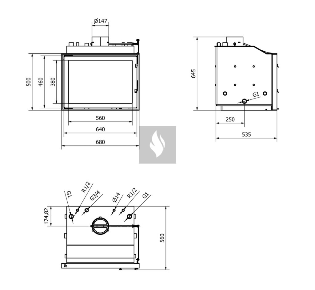 Lehetőség van szükség esetén a vízteres, vízköpenyes tűztér bélelésére, mely csökkentheti a pára, illetve kátrány kicsapódást, valamint növeli a tűztér élettartamát. Nyílt fűtési rendszerhez illeszkedő vízköpenyes kandallóbetét. További opciók: külsőlevegő csatlakozás.