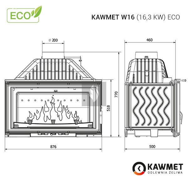 A KAWMET W16 (16,3 kW) ECO öntvény kandallóbetét egy klasszikus öntvény kandallóbetét az ECO sorozatból. Ennek a KAWMET öntvény kandallóbetétnek számos előnye van, amelyek közül a legfontosabb a környezetbarát tervezési követelményeknek való megfelelés, a tökéletes kialakítás és a nagy teljesítmény.