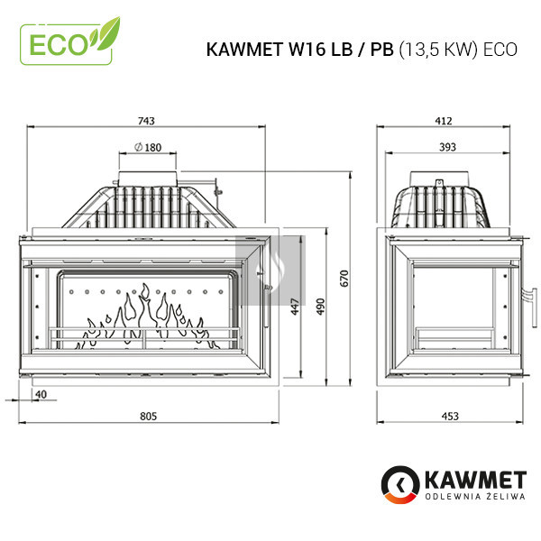 A KAWMET W16 LB (13,5 kW) ECO öntvény balos kandallóbetét egy klasszikus öntvény kandallóbetét az ECO sorozatból. Ennek a KAWMET öntvény kandallóbetétnek számos előnye van, amelyek közül a legfontosabb a környezetbarát tervezési követelményeknek való megfelelés, a tökéletes kialakítás és a nagy teljesítmény.