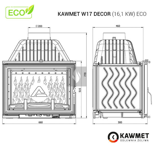 A KAWMET W17 Decor (16,1 kW) ECO öntvény kandallóbetét egy klasszikus öntvény kandallóbetét az ECO sorozatból. Ennek a KAWMET öntvény kandallóbetétnek számos előnye van, amelyek közül a legfontosabb a környezetbarát tervezési követelményeknek való megfelelés, a tökéletes kialakítás és a nagy teljesítmény.
