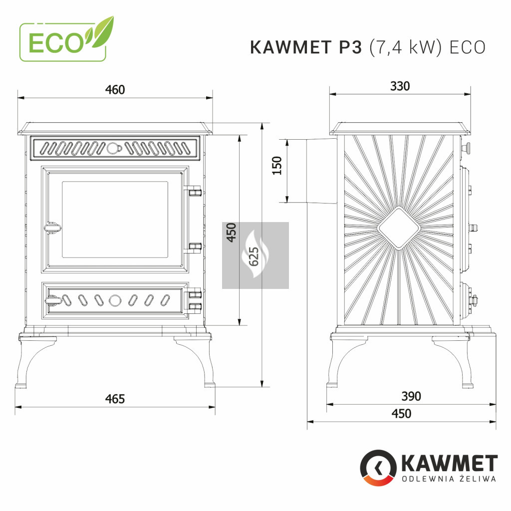 A KAWMET P3 (7,4 kW) ECO öntvény kandallókályha egy klasszikus öntvény kandallókályha az ECO sorozatból. Ennek a KAWMET öntvény kandallókályhának számos előnye van, amelyek közül a legfontosabb a környezetbarát tervezési követelményeknek való megfelelés, a tökéletes kialakítás és a nagy teljesítmény.
