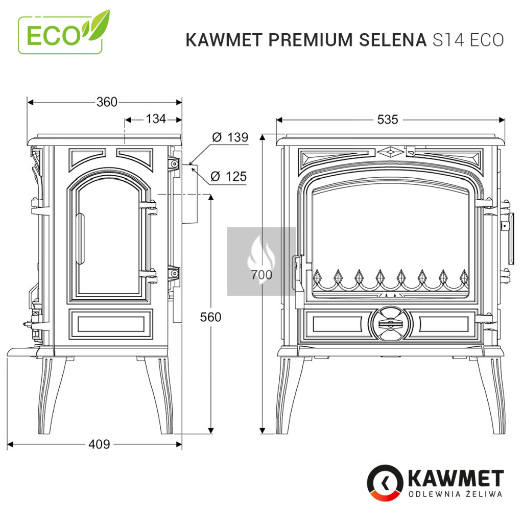 A KAWMET Premium SELENA S14 ECO öntvény kandallókályha egy klasszikus öntvény kandallókályha a PREMIUM sorozatból. Ennek a KAWMET öntvény kandallókályhának számos előnye van, amelyek közül a legfontosabb a környezetbarát tervezési követelményeknek való megfelelés, a tökéletes kialakítás és a nagy teljesítmény.