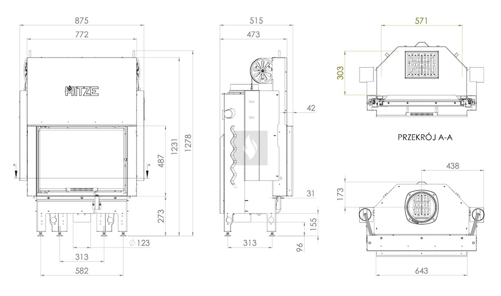 A kerámia betét felhalmozza a hőt és akár 1000°C-ig ellenáll a hőmérsékletnek. A klasszikus hatszögletű égéstér kisebb mérete magasabb égési hőmérsékletet eredményez. A rács és a hamutálca megkönnyíti a hamu eltávolítását és a fa maradványainak összegyűjtését. Az AL120x43 modell kivételével, amely nem rendelkezik ráccsal.