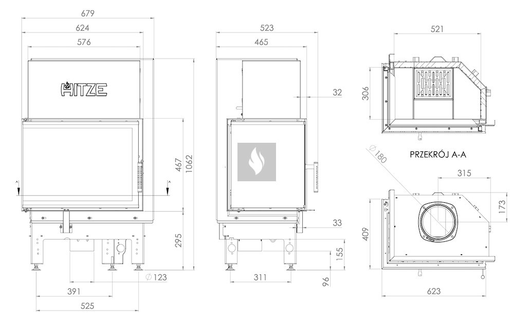 A kerámia betét felhalmozza a hőt és akár 1000°C-ig ellenáll a hőmérsékletnek. A klasszikus hatszögletű égéstér kisebb mérete magasabb égési hőmérsékletet eredményez. A rács és a hamutálca megkönnyíti a hamu eltávolítását és a fa maradványainak összegyűjtését. Az AL120x43 modell kivételével, amely nem rendelkezik ráccsal.