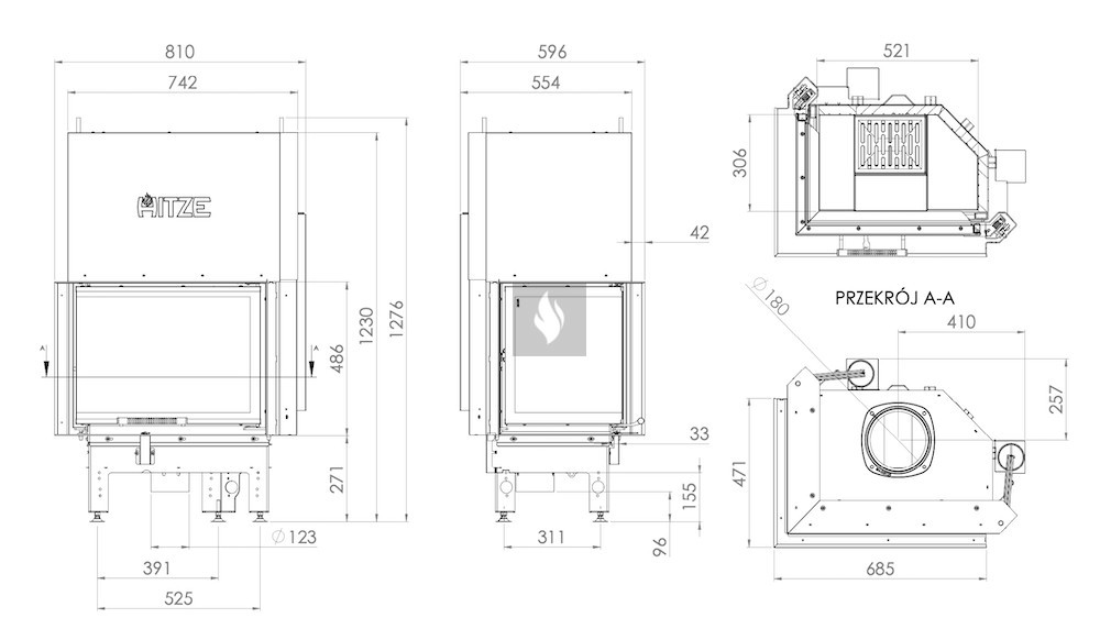 Az ø180 / 200 / 220 / 250 mm-es füstcső biztosítja a kandalló és a kéménycsatorna szoros csatlakozását, biztosítva a megfelelő égést és növelve a hőcsere területét. A hőcsövek növelik a hőcserélési és felhalmozási területet (modelltől függően 3-6 db). Az acél ajtó megnövelt merevségű profilból készült, ami garantálja az ajtó szorosságát és szilárdságát. A hőálló kerámiaüveg (DECOR üveg) akár 800°C-ig ellenáll a működési hőmérsékletnek, és opcionálisan dupla üvegezési rendszerben is elérhető.