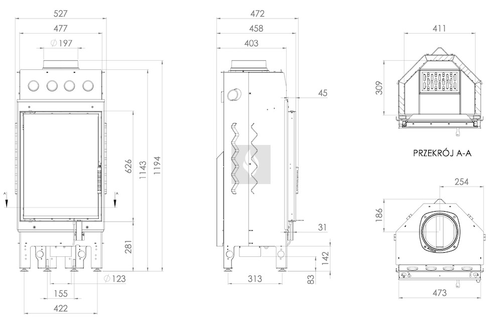 A kerámia betét felhalmozza a hőt és akár 1000°C-ig ellenáll a hőmérsékletnek. A klasszikus hatszögletű égéstér kisebb mérete magasabb égési hőmérsékletet eredményez. A rács és a hamutálca megkönnyíti a hamu eltávolítását és a fa maradványainak összegyűjtését. Az AL120x43 modell kivételével, amely nem rendelkezik ráccsal.