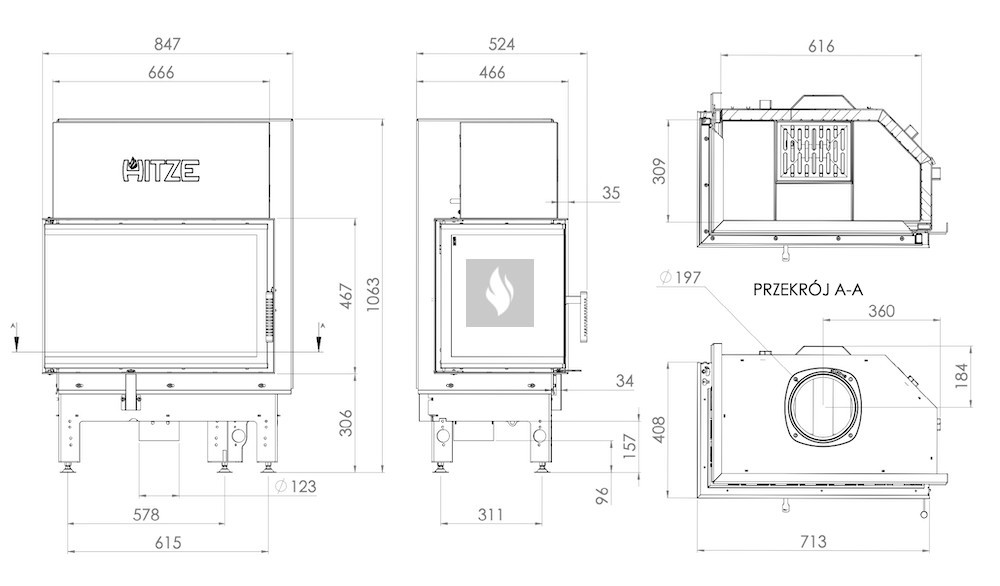 A kerámia betét felhalmozza a hőt és akár 1000°C-ig ellenáll a hőmérsékletnek. A klasszikus hatszögletű égéstér kisebb mérete magasabb égési hőmérsékletet eredményez. A rács és a hamutálca megkönnyíti a hamu eltávolítását és a fa maradványainak összegyűjtését. Az AL120x43 modell kivételével, amely nem rendelkezik ráccsal.