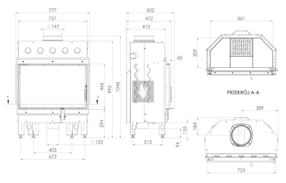 A kerámia betét felhalmozza a hőt és akár 1000°C-ig ellenáll a hőmérsékletnek. A klasszikus hatszögletű égéstér kisebb mérete magasabb égési hőmérsékletet eredményez. A rács és a hamutálca megkönnyíti a hamu eltávolítását és a fa maradványainak összegyűjtését. Az AL120x43 modell kivételével, amely nem rendelkezik ráccsal.