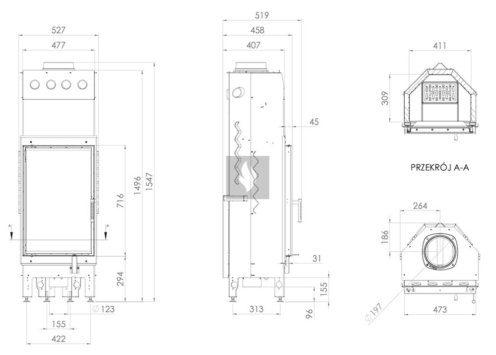 A kerámia betét felhalmozza a hőt és akár 1000°C-ig ellenáll a hőmérsékletnek. A klasszikus hatszögletű égéstér kisebb mérete magasabb égési hőmérsékletet eredményez. A rács és a hamutálca megkönnyíti a hamu eltávolítását és a fa maradványainak összegyűjtését. Az AL120x43 modell kivételével, amely nem rendelkezik ráccsal.
