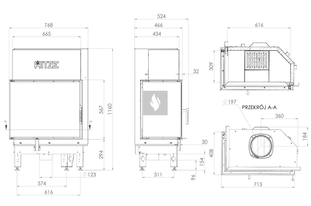 A kerámia betét felhalmozza a hőt és akár 1000°C-ig ellenáll a hőmérsékletnek. A klasszikus hatszögletű égéstér kisebb mérete magasabb égési hőmérsékletet eredményez. A rács és a hamutálca megkönnyíti a hamu eltávolítását és a fa maradványainak összegyűjtését. Az AL120x43 modell kivételével, amely nem rendelkezik ráccsal.