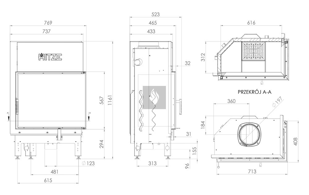 A kerámia betét felhalmozza a hőt és akár 1000°C-ig ellenáll a hőmérsékletnek. A klasszikus hatszögletű égéstér kisebb mérete magasabb égési hőmérsékletet eredményez. A rács és a hamutálca megkönnyíti a hamu eltávolítását és a fa maradványainak összegyűjtését. Az AL120x43 modell kivételével, amely nem rendelkezik ráccsal.