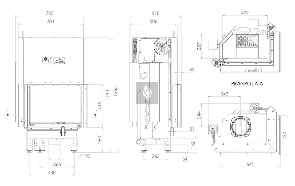 A kerámia betét felhalmozza a hőt és akár 1000°C-ig ellenáll a hőmérsékletnek. A klasszikus hatszögletű égéstér kisebb mérete magasabb égési hőmérsékletet eredményez. A rács és a hamutálca megkönnyíti a hamu eltávolítását és a fa maradványainak összegyűjtését. Az AL120x43 modell kivételével, amely nem rendelkezik ráccsal.