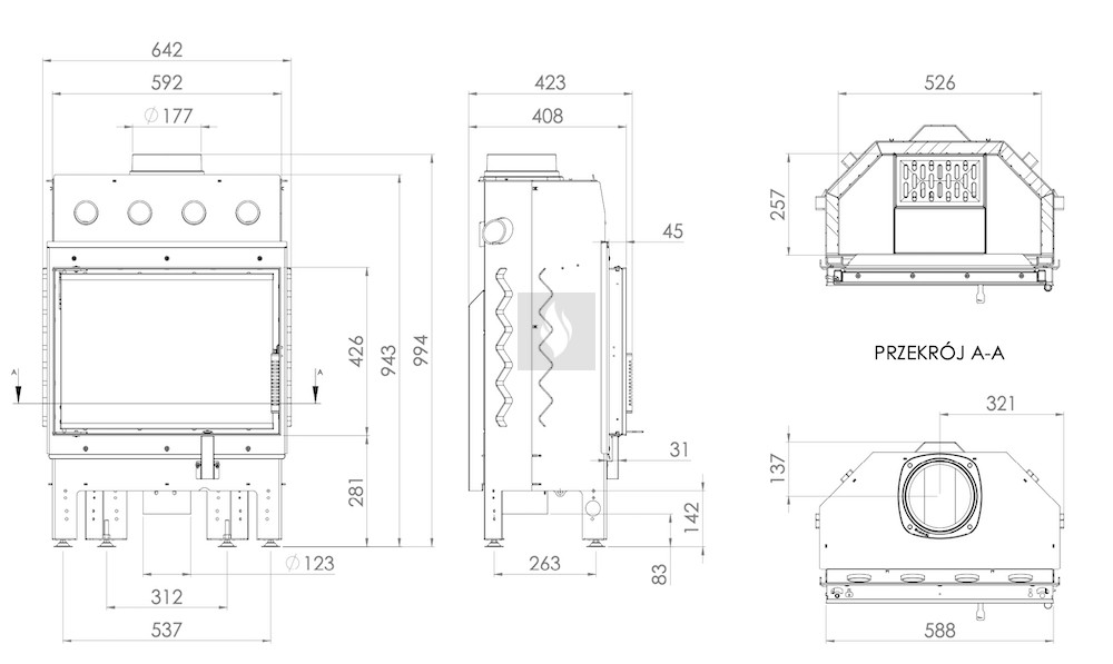 A kerámia betét felhalmozza a hőt és akár 1000°C-ig ellenáll a hőmérsékletnek. A klasszikus hatszögletű égéstér kisebb mérete magasabb égési hőmérsékletet eredményez. A rács és a hamutálca megkönnyíti a hamu eltávolítását és a fa maradványainak összegyűjtését. Az AL120x43 modell kivételével, amely nem rendelkezik ráccsal.