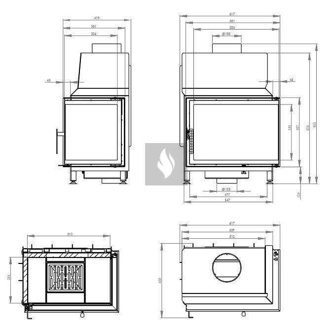 A hőálló kerámiaüveg biztosítja a magas hőmérsékletnek (akár 800°C-ig) való ellenállást, és opcionálisan dupla üvegezési rendszerben is elérhető. Az ø125 mm-es légbevezető nyílás és a betét acél alapja lemezes légfojtóval van ellátva. Az ø180 mm-es öntöttvas füstcső garantálja a kandalló és a kéménycsatorna szoros csatlakozását, biztosítva a megfelelő égést és a hőcsere területének növelését. A rács és a hamutálca megkönnyíti a hamu eltávolítását és a fa maradványainak összegyűjtését.
