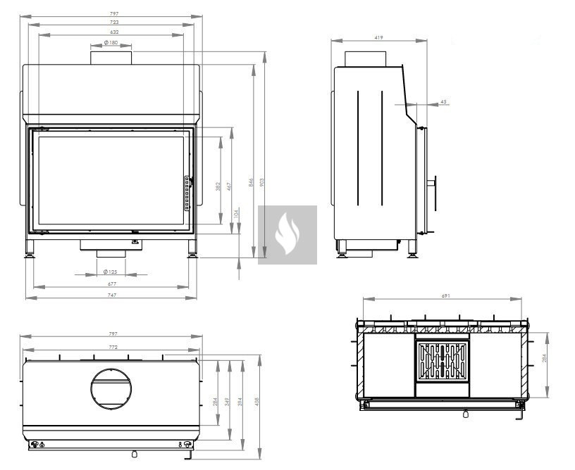 A hőálló kerámiaüveg biztosítja a magas hőmérsékletnek (akár 800°C-ig) való ellenállást, és opcionálisan dupla üvegezési rendszerben is elérhető. Az ø125 mm-es légbevezető nyílás és a betét acél alapja lemezes légfojtóval van ellátva. Az ø180 mm-es öntöttvas füstcső garantálja a kandalló és a kéménycsatorna szoros csatlakozását, biztosítva a megfelelő égést és a hőcsere területének növelését. A rács és a hamutálca megkönnyíti a hamu eltávolítását és a fa maradványainak összegyűjtését.
