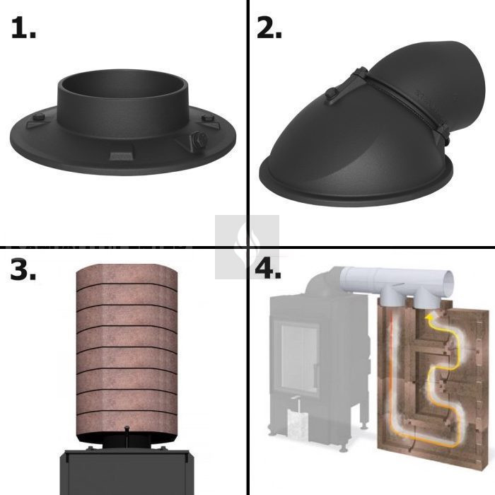 • Egyes készülék esetében öntvényből készült örvénykamra növeli a hőleadást. Ez a masszív elem meglepően nagy hőleadó felületet biztosít. Geometriája elősegíti, hogy a készülékből távozó füstgázok nagy utat bejárva távozzanak a kéménybe, növelve ezzel a berendezés hatásfokát. A két részből álló elem elfordítható egymáshoz képest, ami lényegesen olcsóbbá és egyszerűbbé teszi a kéménybe kötést, hiszen plusz könyökök felhasználása nélkül bármilyen irányba állítható csonkot kapunk.