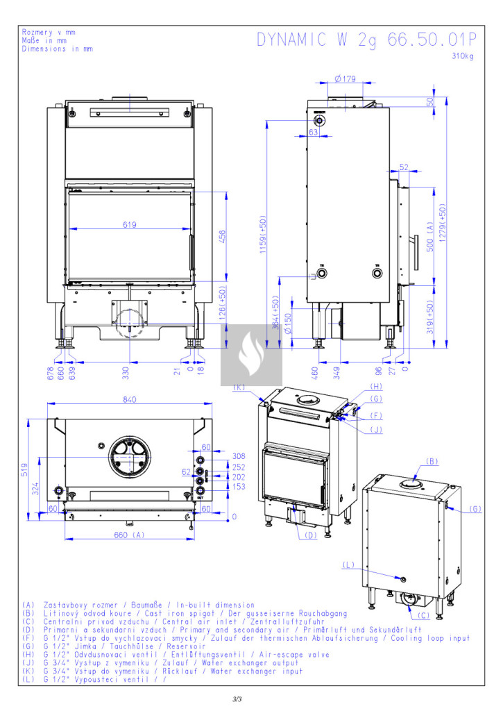P modell - Tripla üvegezéssel ellátott vízteres kandallóbetét. A víztér külső borítása teljes felületén hőszigetelt, növelve ezáltal a vízoldali hőteljesítményt.