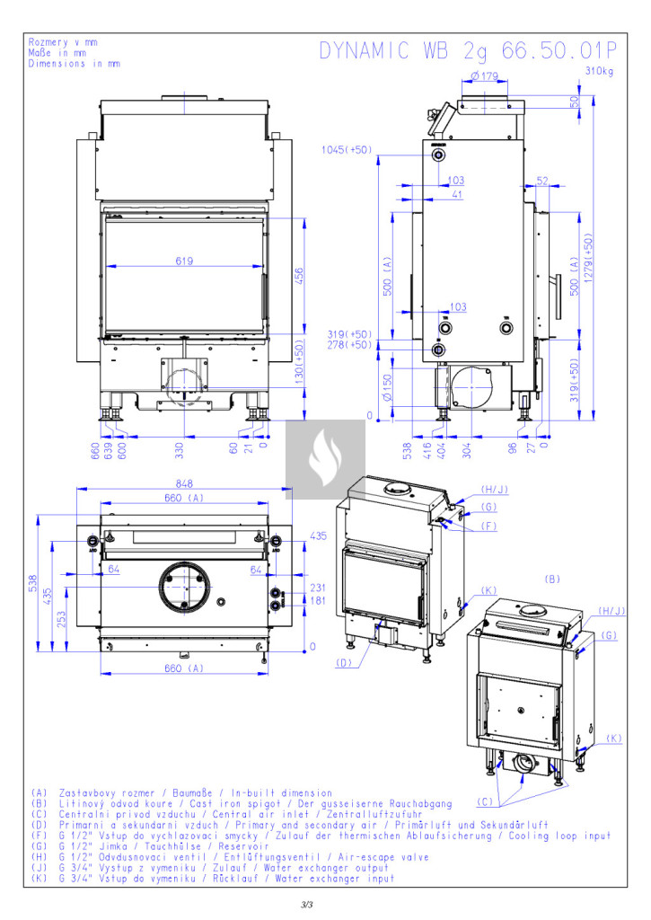 P modell - Tripla üvegezéssel ellátott vízteres kandallóbetét. A víztér külső borítása teljes felületén hőszigetelt, növelve ezáltal a vízoldali hőteljesítményt.